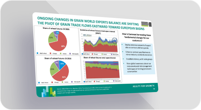 ONGOING CHANGES IN GRAIN WORLD EXPORTS BALANCE ARE SHIFTING THE PIVOT OF GRAIN TRADE FLOWS EASTWARD TOWARD EUROPEAN BASINS Share of wheat futures OI 2006 Evolution of wheat futures total open interest How is Euronext harnessing these 2% (MMT) 7% fundamental changes for our 22% customers? Deploy extensive network of export 69% silos as contracts delivery points Enhance contract specifications to Matif wheat Chicago Kansas Minneapolis Matif wheat Chicago Kansas Minneapolis mirror industry standards evolutions Share of wheat futures OI 2016 Share of wheat futures total open interest Establish intimacy with trade groups 9% 14% Raise global awareness about our instruments and risk management 25% techniques in farming/processors communities 52% Matif wheat Chicago Kansas Minneapolis Matif wheat Chicago Kansas Minneapolis Source: INTL FCStone Inc. (Nasdaq: INTL). The company provides clients across the globe with a AGILITY FOR GROWTH comprehensive range of customised financial services and tools to help them protect their 93 margins and manage volatility