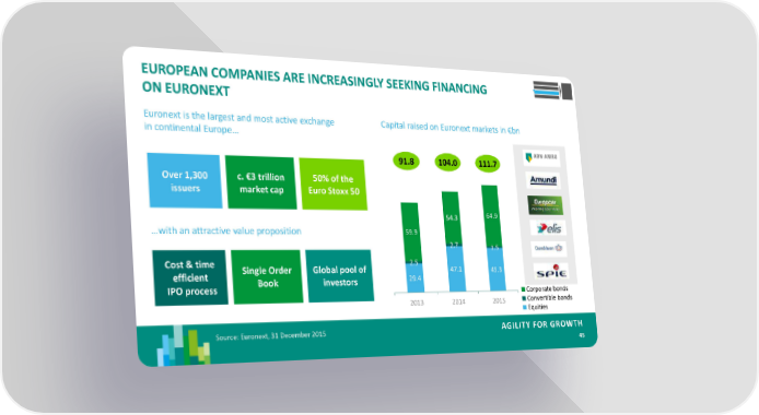 EUROPEAN COMPANIES ARE INCREASINGLY SEEKING FINANCING ON EURONEXT Euronext is the largest and most active exchange Capital raised on Euronext markets in €bn in continental Europe… 91.8 104.0 111.7 Over 1,300 c. €3 trillion 50% of the issuers market cap Euro Stoxx 50 54.3 64.9 …with an attractive value proposition 59.9 2.7 1.5 Cost & time Single Order Global pool of 2.5 47.1 efficient 45.3 IPO process Book investors 29.4 Corporate bonds 2013 2014 2015 Convertible bonds Equities Source: Euronext, 31 December 2015 AGILITY FOR GROWTH 45