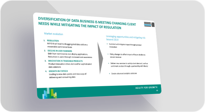 DIVERSIFICATION OF DATA BUSINESS IS MEETING CHANGING CLIENT NEEDS WHILE MITIGATING THE IMPACT OF REGULATION Market evolution Leveraging opportunities and mitigating risk beyond 2019 1. REGULATION Euronext will mitigate impact through product MIFID II will lead to disaggregated data sold on a innovation reasonable commercial basis 2. DECLINE IN USER NUMBERS Shift from terminals to non-display applications. Policy changes to offset impact of future decline to Reduction in users through increased cost awareness secure revenue 3. INNOVATION IN TRADEABLE PRODUCTS Deliver new services to satisfy client demand, such as Product innovation drives demand for sophisticated sentiment analysis through a partnership with Heckyl data solutions 4. GROWTH IN FINTECH Leading to new data points and new ways of Create advanced analytics solutions delivering and consuming data AGILITY FOR GROWTH 63