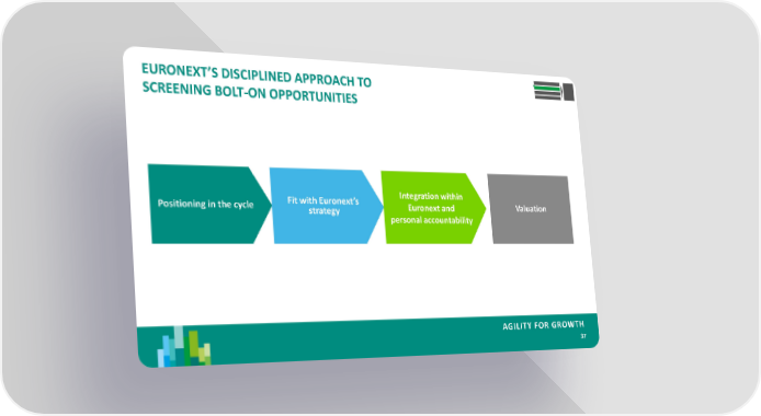 Agility For Growth Page 34 Page 36EURONEXT’S DISCIPLINED APPROACH TO SCREENING BOLT-ON OPPORTUNITIES Integration within Positioning in the cycle Fit with Euronext’s Euronext and Valuation strategy personal accountability AGILITY FOR GROWTH 37
