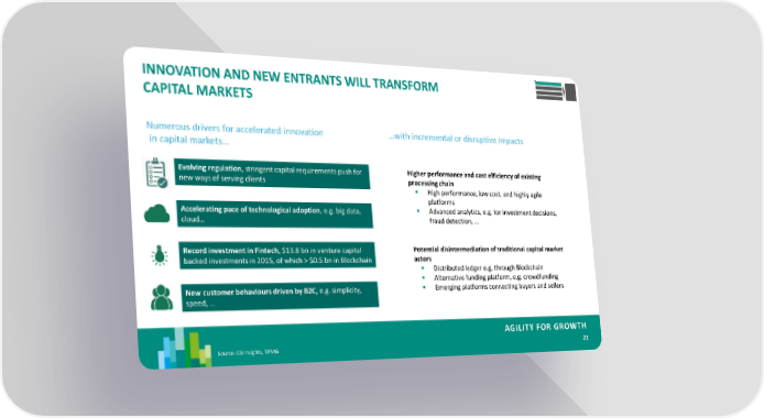 INNOVATION AND NEW ENTRANTS WILL TRANSFORM CAPITAL MARKETS Numerous drivers for accelerated innovation …with incremental or disruptive impacts in capital markets… Evolving regulation, stringent capital requirements push for Higher performance and cost efficiency of existing new ways of serving clients processing chain High performance, low cost, and highly agile platforms Accelerating pace of technological adoption, e.g. big data, Advanced analytics, e.g. for investment decisions, cloud… fraud detection, … Record investment in Fintech, $13.8 bn in venture capital Potential disintermediation of traditional capital market backed investments in 2015, of which > $0.5 bn in Blockchain actors Distributed ledger e.g. through Blockchain Alternative funding platform, e.g. crowdfunding New customer behaviours driven by B2C, e.g. simplicity, Emerging platforms connecting buyers and sellers speed, … AGILITY FOR GROWTH Source: CB Insights, KPMG 21
