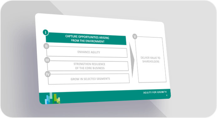 I CAPTURE OPPORTUNITIES ARISING V FROM THE ENVIRONMENT II ENHANCE AGILITY DELIVER VALUE TO III SHAREHOLDERS STRENGTHEN RESILIENCE OF THE CORE BUSINESS IV GROW IN SELECTED SEGMENTS AGILITY FOR GROWTH 8