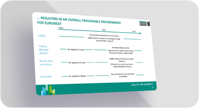 … RESULTING IN AN OVERALL FAVOURABLE ENVIRONMENT FOR EURONEXT Today 2018 2019 Growing debt and equity financing needs Listing Opportunity to capture more listings through increased SME outreach Trading Growing trading volumes (all asset No regulatory change Opportunity to capture more activity classes) through innovative market models Stable margins on existing raw data Market data No regulatory change business and indices Mitigation by expanding towards added-value data offering Post trade No regulatory change Neutral impact as local exemption possibilities AGILITY FOR GROWTH 19