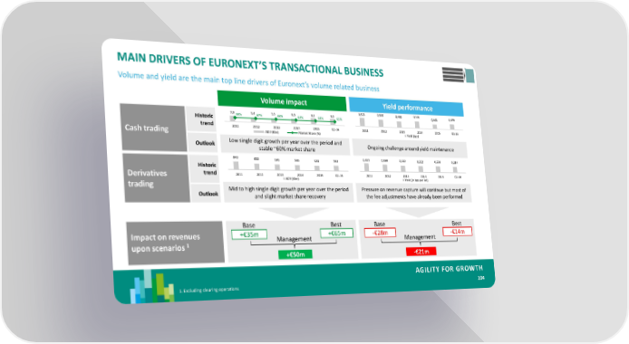 MAIN DRIVERS OF EURONEXT’S TRANSACTIONAL BUSINESS Volume and yield are the main top line drivers of Euronext’s volume related business Volume impact Yield performance 7,0 5,4 5,5 6,5 8,3 8,3 0,523 0,505 0,492 0,501 0,465 0,478 Historic 68% 67% 66% 64% 64% 61% trend 2011 2012 2013 2014 2015 Q1-16 2011 2012 2013 2014 2015 Q1-16 Cash trading ADV (€bn) Market Share (%) Yield (bps) Outlook Low single digit growth per year over the period and Ongoing challenge around yield maintenance stable ~60% market share 843 653 576 565 529 563 0,424 0,369 0,332 0,322 0,328 0,314 Historic Derivatives trend 2011 2012 2013 2014 2015 Q1-16 2011 2012 2013 2014 2015 Q1-16 trading ADV (€bn) Yield (in bps per lot) Outlook Mid to high single digit growth per year over the period Pressure on revenue capture will continue but most of and slight market share recovery the fee adjustments have already been performed Base Best Base Best Impact on revenues +€35m Management +€65m -€28m Management -€14m 1 upon scenarios +€50m -€21m AGILITY FOR GROWTH 1.Excluding clearing operations 104