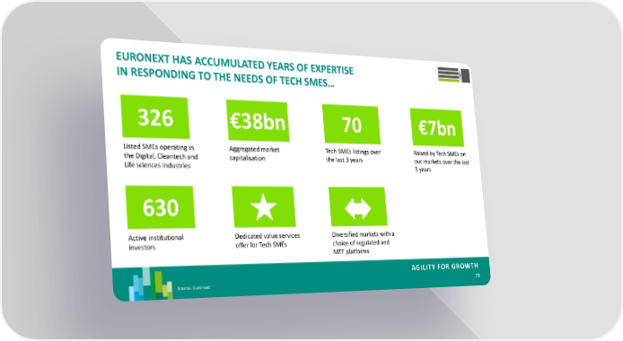 EURONEXT HAS ACCUMULATED YEARS OF EXPERTISE IN RESPONDING TO THE NEEDS OF TECH SMES… 326 €38bn 70 €7bn Listed SMEs operating in Aggregated market Tech SMEs listings over Raised by Tech SMEs on the Digital, Cleantech and capitalisation the last 3 years our markets over the last Life sciences industries 3 years 630 Active institutional Dedicated value services Diversified markets with a investors offer for Tech SMEs choice of regulated and MTF platforms AGILITY FOR GROWTH Source: Euronext 73