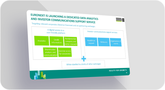 EURONEXT IS LAUNCHING A DEDICATED DATA ANALYTICS AND INVESTOR COMMUNICATIONS SUPPORT SERVICE Targeting relevant corporates listed on Euronext and on partnering exchanges A digital access to a Investor communications support services user-friendly platform Credit Fundamental Roadshow Organisation of Analytics information company and support Webcasts events sector research Shareholder Investor access analysis and for corporates communication White-labelled to clients of other exchanges AGILITY FOR GROWTH 78