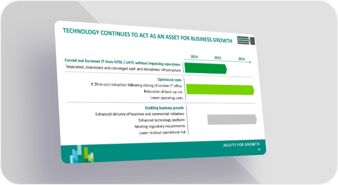 TECHNOLOGY CONTINUES TO ACT AS AN ASSET FOR BUSINESS GROWTH 2014 2015 2016 Carved out Euronext IT from NYSE / LIFFE without impacting operations Separated, downsized and converged cash and derivatives infrastructure Optimised costs € 20 m cost reduction following closing of London IT office Relocation of back-up site Lower operating costs Enabling business growth Enhanced delivery of business and commercial initiatives Enhanced technology platform Meeting regulatory requirements Lower residual operational risk AGILITY FOR GROWTH 32