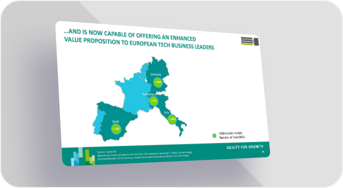 …AND IS NOW CAPABLE OF OFFERING AN ENHANCED VALUE PROPOSITION TO EUROPEAN TECH BUSINESS LEADERS > 2000 > 250 > 1000 > 1300 Addressable market Number of Tech SMEs Source: Capital IQ AGILITY FOR GROWTH Market size: assess companies with less than 250 employees operating in Media, Biotechnology, 74 Internet Software, Online Services, Telecommunication Services and Health Care Technology