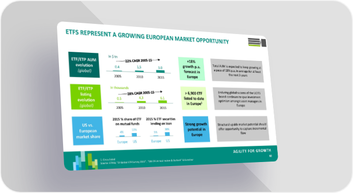 ETFS REPRESENT A GROWING EUROPEAN MARKET OPPORTUNITY In $ tn +18% ETF/ETP AUM growth p.a. Total AUM is expected to keep growing at evolution 0.4 1,5 3.0 forecast in a pace of 18% p.a. in average for at least (global) Europe the next 3 years 2005 2010 2015 ETF/ETP In thousands Enduring global success of the UCITS listing > 6,900 ETF brand continues to spur investment evolution 0.5 4,3 6.1 listed to date optimism amongst asset managers in 1 (global) in Europe Europe 2005 2010 2015 2015 % share of ETF 2015 % ETF securities US vs. on mutual funds lending on loan Strong growth Structural upside market potential should European 4% 11% 5% 30% potential in offer opportunity to capture incremental market share Europe flow Europe US Europe US AGILITY FOR GROWTH 1. Cross listed 82 Source: ETFGI, “EY Global ETF Survey 2015” , “DB ETF Annual review & Outlook” & Euroclear