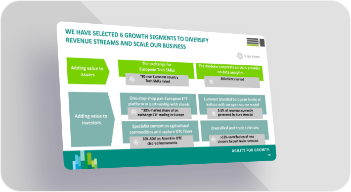 WE HAVE SELECTED 6 GROWTH SEGMENTS TO DIVERSIFY REVENUE STREAMS AND SCALE OUR BUSINESS 3-year targets The exchange for The modular corporate services provider Adding value to European Tech SMEs on data analytics issuers ~80 non Euronext country 800 clients served Tech SMEs listed One-stop-shop pan-European ETF Euronext branded European family of platform in partnership with clients indices with an open source model ~30% market share of on 2-5% of revenues currently Adding value to exchange ETF trading in Europe generated by Euro Stoxx50 investors Specialist content on agricultural Diversified post trade solutions commodities and capture OTC flows 10K ADV on AtomX in OTC >12% contribution of new cleared instruments streams to post trade revenues AGILITY FOR GROWTH 70