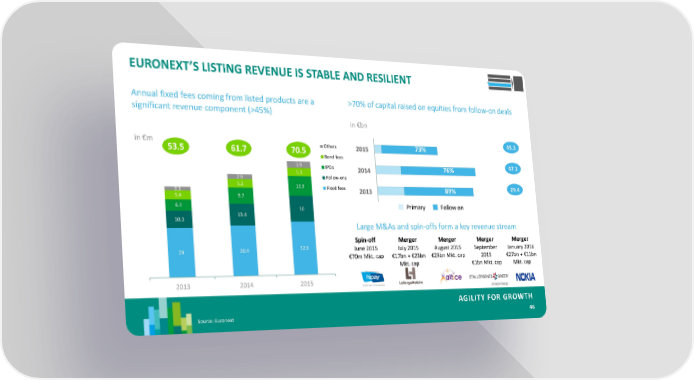 EURONEXT’S LISTING REVENUE IS STABLE AND RESILIENT Annual fixed fees coming from listed products are a >70% of capital raised on equities from follow-on deals significant revenue component (>45%) in €bn in €m Others 73% 45.3 53.5 61.7 70.5 Bond fees 3.9 IPOs 76% 47.1 5.3 Follow-ons 2.9 5.3 12.3 Fixed fees 89% 29.4 2.1 5.4 9.7 6.7 16 Primary Follow on 10.3 13.4 Large M&As and spin-offs form a key revenue stream Spin-off Merger Merger Merger Merger 29 30.4 32.9 June 2015 July 2015 August 2015 September January 2016 €70m Mkt. cap €17bn + €23bn €29bn Mkt. cap 2015 €27bn + €11bn Mkt. cap €1bn Mkt. cap Mkt. cap 2013 2014 2015 AGILITY FOR GROWTH Source: Euronext 46