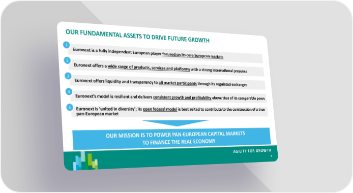 OUR FUNDAMENTAL ASSETS TO DRIVE FUTURE GROWTH 1 Euronext is a fully independent European player focused on its core European markets 2 Euronext offers a wide range of products, services and platforms with a strong international presence 3 Euronext offers liquidity and transparency to all market participants through its regulated exchanges 4 Euronext’s model is resilient and delivers consistent growth and profitability above that of its comparable peers 5 Euronext is ‘united in diversity’; its open federal model is best suited to contribute to the construction of a true pan-European market OUR MISSION IS TO POWER PAN-EUROPEAN CAPITAL MARKETS TO FINANCE THE REAL ECONOMY AGILITY FOR GROWTH 4