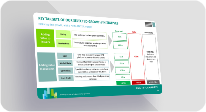 KEY TARGETS OF OUR SELECTED GROWTH INITIATIVES €70m top line growth, with a ~50% EBITDA margin 1 1 Revenues OpEx Investments Adding Listing The exchange for European Tech SMEs €5m value to issuers Market Data The modular corporate services provider €29m on data analytics €100-150m One-stop-shop pan-European ETF for bolt-on Cash platform in partnership with clients €6m €35m acquisitions and development Euronext branded European family of costs Adding value Market Data indices with an open source model €12m to investors Derivatives Specialist content provider on agricultural €10m commodities and capture OTC flows Post-Trade Creating options and diversified post-trade €8m solutions +€70m +€35m +€100-150m AGILITY FOR GROWTH 1.Excluding current derivatives clearing agreement 106