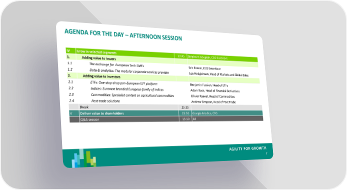 AGENDA FOR THE DAY – AFTERNOON SESSION IV Grow in selected segments 13:45 Stéphane Boujnah, CEO Euronext 1. Adding value to issuers 1.1 The exchange for European Tech SMEs Eric Forest, CEO EnterNext 1.2 Data & analytics: The modular corporate services provider Lee Hodgkinson, Head of Markets and Global Sales 2. Adding value to investors 2.1 ETFs: One-stop-shop pan-European ETF platform Benjamin Fussien, Head of ETFs 2.2 Indices: Euronext branded European family of indices Adam Rose, Head of Financial Derivatives 2.3 Commodities: Specialist content on agricultural commodities Olivier Raevel, Head of Commodities 2.4 Post trade solutions Andrew Simpson, Head of Post Trade Break 15:15 V Deliver value to shareholders 15:30 Giorgio Modica, CFO Q&A session 15:50 All AGILITY FOR GROWTH 7