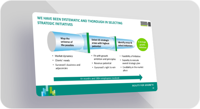 WE HAVE BEEN SYSTEMATIC AND THOROUGH IN SELECTING STRATEGIC INITIATIVES Map the Select 15 strategic Identify areas & 6 strategic universe of areas with highest select initiatives growth the possible potential initiatives • Market dynamics • Fit with growth • Feasibility of initiative • Clients’ needs ambition and principles • Capacity to execute • Euronext’s business and • Revenue potential overall strategic plan adjacencies • Euronext’s right to win • Credibility in the market place 4+ months and 100+ employees involved AGILITY FOR GROWTH 69