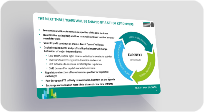 THE NEXT THREE YEARS WILL BE SHAPED BY A SET OF KEY DRIVERS Economic conditions to remain supportive of the core business Quantitative easing (QE) and low rates will continue to drive investor search for yield Volatility will continue as theme; Brexit “pause” will pass Capital requirements and profitability challenges will change behaviour of major intermediaries: • Low-touch, capital light, cleared activities to dominate activity • Investors to exercise greater discretion and control • HFT activities to continue amidst tighter regulation • SME demand for capital markets to increase Regulatory direction of travel remains positive for regulated exchanges Pan-European FTT unlikely to materialise, but stays on the agenda Exchange consolidation more likely than not - few new entrants AGILITY FOR GROWTH 10