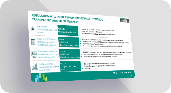 REGULATION WILL INCREASINGLY DRIVE VALUE TOWARDS TRANSPARENT AND OPEN MARKETS… Pressure of CRD IV Push for more equity and debt market-based financing disintermediation will Prospectus directive Easier SME access to public listing remain Rise of electronic markets for capital intensive products Push of OTC towards EMIR Push of OTC and dark volumes in equity towards transparent markets transparent market MiFIDII/R Most standard and liquid OTC derivatives pushed towards on-exchange trading models will increase Benchmark regulation Push for exchange-based indices Benchmark regulation ending banks marking their own homework No material move on EMIR Post 2020 opening of access to index licences, regulation remains silent on pricing market data and post- MiFIDII/R Post 2020 clearing open access along local exemption possibilities trade before 2020 Benchmark regulation Increased transparency over market data fees and costs European single CSDR Pan-European settlement framework and platform market will be further Target 2 Securities Further European integration of laws on securities incentivised CMU MiFID III… AGILITY FOR GROWTH 18