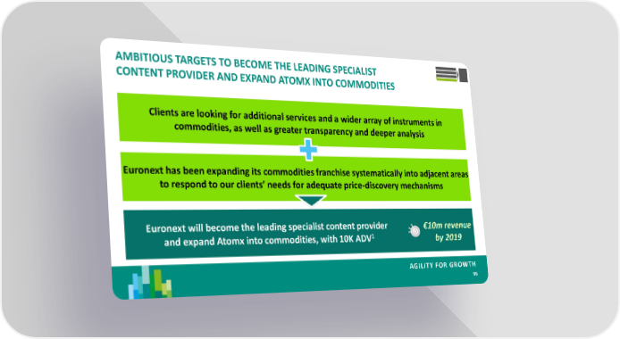 AMBITIOUS TARGETS TO BECOME THE LEADING SPECIALIST CONTENT PROVIDER AND EXPAND ATOMX INTO COMMODITIEST PROVIDER COMMODITIES Clients are looking for additional services and a wider array of instruments in commodities, as well as greater transparency and deeper analysis Euronext has been expanding its commodities franchise systematically into adjacent areas to respond to our clients’ needs for adequate price-discovery mechanisms Euronext will become the leading specialist content provider €10m revenue and expand Atomx into commodities, with 10K ADV1 by 2019 AGILITY FOR GROWTH 96