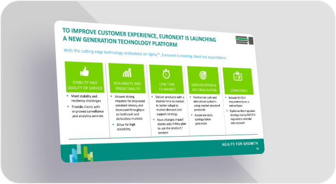 TO IMPROVE CUSTOMER EXPERIENCE, EURONEXT IS LAUNCHING A NEW GENERATION TECHNOLOGY PLATFORM With the cutting edge technology embedded on Optiq™, Euronext is meeting client key expectations STABILITY AND SCALABILITY AND LOW TIME SIMPLIFICATION & QUALITY OF SERVICE PREDICTABILITY TO MARKET RATIONALISATION COMPLIANCE Meet stability and Answer strong Deliver products with a Harmonise cash and Include MiFID II resiliency challenges requests for improved shorter time to market derivatives systems requirements on a Provide clients with constant latency and to better adapt to using market standard native basis improved surveillance increased throughput market demand and protocols Optimise the migration and analytics services on both cash and support strategy Automate daily strategy taking MiFID II derivatives markets Have changes impact configuration regulatory calendar Allow for high clients only if they plan processes into account scalability to use the product / services AGILITY FOR GROWTH 35