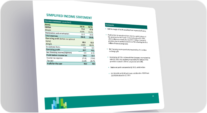 SIMPLIFIED INCOME STATEMENT Income statement (unaudited) Comments (€mm) Q1'16 Q1'15 EBITDA margin of 56.8% benefited from improved efficiency EBITDA 71.8 67.8 Margin 56.8% 52.2% Depreciation and amortisation (3.7) (4.6) Positive item in exceptional items due to a partial release of Total expenses (58.4) (66.8) the provision for the French restructuring plans (Q1 2015: Operating profit (before exceptional +€6.3 million was mostly due to a €14.7 million reversal of provision due to positive outcome on CBH offsetting the €7.4 items) 68.0 63.3 million of restructuring costs) Margin 53.8% 48.6% Exceptional items 0.6 6.3 Net financing income positively impacted by a €1.5 million Operating profit 68.7 69.6 exchange gain Net financing income/(expense) 0.9 (2.1) Profit before income tax 69.6 67.4 Income tax of 31% is in line with the Company’s normalized tax Income tax expense (21.6) (19.4) rate (Q1 2015 was positively impacted by the release of the Tax rate -31.0% -28.7% provision created in 2014 in conjunction with CBH) Profit for the year 48.0 48.0 Stable net profit compared to Q1 2015, at €48 million Q1 2016 EPS of €0.69 both basic and diluted vs €0.69 basic and €0.68 diluted in Q1 2015 10