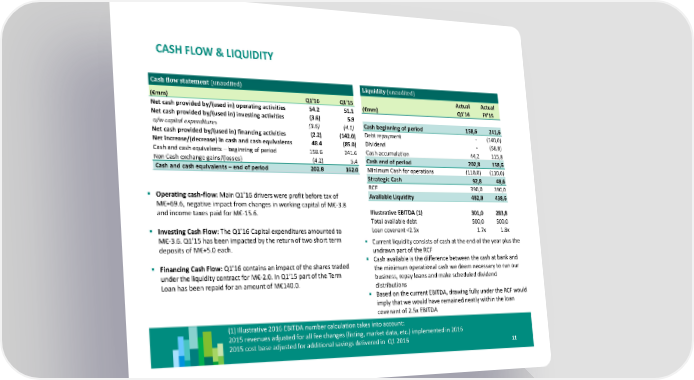 CASH FLOW & LIQUIDITY Cash flow statement (unaudited) Liquidity (unaudited) Actual Actual (€mm) Q1'16 Q1'15 (€mm) Q1'16 FY'15 Net cash provided by/(used in) operating activities 54.2 51.1 Net cash provided by/(used in) investing activities (3.6) 5.9 o/w capital expenditures (3.6) (4.1) Cash beginning of period 158,6 241,6 Net cash provided by/(used in) financing activities (2.2) (142.0) Debt repayment - (140,0) Net increase/(decrease) in cash and cash equivalents 48.4 (85.0) Dividend - (58,8) Cash and cash equivalents – beginning of period 158.6 241.6 Cash accumulation 44,2 115,8 Non Cash exchange gains/(losses) (4.2) 5.4 Cash end of period 202,8 158,6 Cash and cash equivalents – end of period 202.8 162.0 Minimum Cash for operations (110,0) (110,0) Strategic Cash 92,8 48,6 RCF 390,0 390,0 Operating cash-flow: Main Q1’16 drivers were profit before tax of Available Liquidity 482,8 438,6 M€+69.6, negative impact from changes in working capital of M€-3.8 and income taxes paid for M€-15.6. Illustrative EBITDA (1) 301,0 283,8 Total available debt 500,0 500,0 Investing Cash Flow: The Q1’16 Capital expenditures amounted to Loan covenant <2.5x 1.7x 1.8x M€-3.6. Q1’15 has been impacted by the return of two short term Current liquidity consists of cash at the end of the year plus the deposits of M€+5.0 each. undrawn part of the RCF Financing Cash Flow: Q1’16 contains an impact of the shares traded Cash available is the difference between the cash at bank and under the liquidity contract for M€-2.0. In Q1’15 part of the Term the minimum operational cash we deem necessary to run our Loanhas been repaid for an amountof M€140.0. business, repay loans and make scheduled dividend distributions Based on the current EBITDA, drawing fully under the RCF would imply that we would have remained neatly within the loan covenant of 2.5x EBITDA (1) Illustrative 2016 EBITDA number calculation takes into account: 2015 revenues adjusted for all fee changes (listing, market data, etc.) implemented in 2016 2015 cost base adjusted for additional savings delivered in Q1 2016 11
