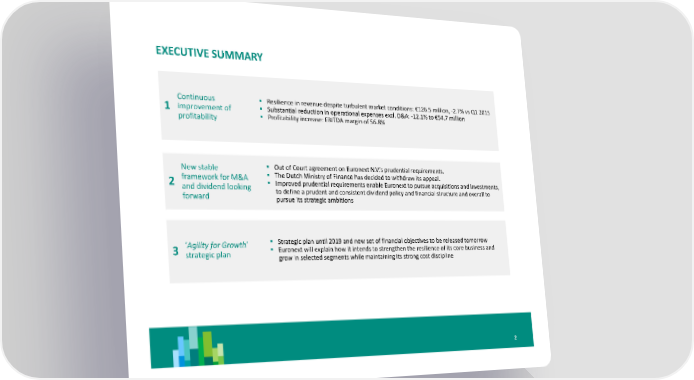 EXECUTIVE SUMMARY Continuous Resilience in revenue despite turbulent market conditions: €126.5 million, -2.7% vs Q1 2015 1 improvement of Substantial reduction in operational expenses excl. D&A: -12.1% to €54.7 million profitability Profitability increase: EBITDA margin of 56.8% New stable Out of Court agreement on Euronext N.V.’s prudential requirements. framework for M&A The Dutch Ministry of Finance has decided to withdraw its appeal. 2 and dividend looking Improved prudential requirements enable Euronext to pursue acquisitions and investments, forward to define a prudent and consistent dividend policy and financial structure and overall to pursue its strategic ambitions ‘Agility for Growth’ Strategic plan until 2019 and new set of financial objectives to be released tomorrow 3 strategic plan Euronext will explain how it intends to strengthen the resilience of its core business and grow in selected segments while maintaining its strong cost discipline 2