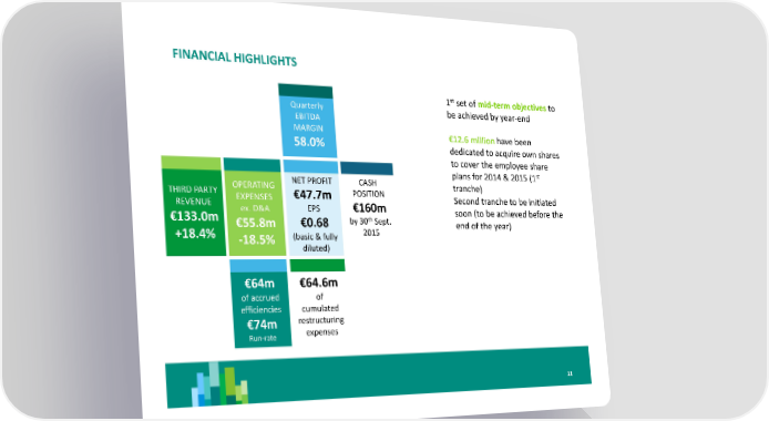 FINANCIAL HIGHLIGHTS st 1 set of mid-term objectives to Quarterly be achieved by year-end EBITDA MARGIN €12.6 million have been 58.0% dedicated to acquire own shares to cover the employee share st NET PROFIT CASH plans for 2014 & 2015 (1 THIRD PARTY OPERATING €47.7m POSITION tranche) REVENUE EXPENSES €160m Second tranche to be initiated ex. D&A EPS soon (to be achieved before the €133.0m th €55.8m €0.68 by 30 Sept. end of the year) +18.4% -18.5% (basic & fully 2015 diluted) €64m €64.6m of accrued of efficiencies cumulated €74m restructuring Run-rate expenses 11
