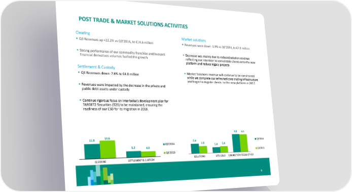 POST TRADE & MARKET SOLUTIONS ACTIVITIES Clearing Market solutions Q3 Revenues up +22.2% vs Q3’2014, to €14.6 million Revenues were down -5.9% vs Q3’2014, to €7.9 million Strong performance of our commodity franchise and buoyant Decrease was mainly due to reduced solution revenue financial derivatives volumes fuelled the growth reflecting our intention to consolidate clients onto the new platform and reduce legacy projects Settlement & Custody Market Solutions revenue will continue to be constrained Q3 Revenues down -7.6% to €4.8 million while we complete our refreshed core trading infrastructure and begin to migrate clients to the new platform in 2017 Revenues were impacted by the decrease in the private and public debt assets under custody Continue rigorous focus on Interbolsa’s development plan for TARGET2-Securities (T2S) to be maintained, ensuring the readiness of our CSD for its migration in 2016. 4.6 4.5 11.9 14.6 2.4 Q3'2014 Q3'2014 1.8 1.4 1.6 5.2 4.8 Q3'2015 Q3'2015 CLEARING SETTLEMENT & CUSTODY SOLUTIONS SFTI COLO CONNECTION FEES & OTHER 9
