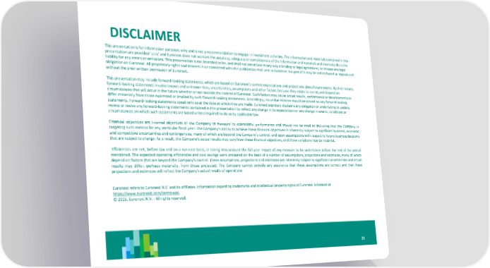 DISCLAIMER This presentation is for information purposes only and is not a recommendation to engage in investment activities. The information and materials contained in this presentation are provided ‘as is’ and Euronext does not warrant the accuracy, adequacy or completeness of the information and materials and expressly disclaims liability for any errors or omissions. This presentation is not intended to be, and shall not constitute in any way a binding or legal agreement, or impose any legal obligation on Euronext. All proprietary rights and interest in or connected with this publication shall vest in Euronext. No part of it may be redistributed or reproduced without the prior written permission of Euronext. This presentation may include forward-looking statements, which are based on Euronext’s current expectations and projections about future events. By their nature, forward-looking statements involve known and unknown risks, uncertainties, assumptions and other factors because they relate to events and depend on circumstances that will occur in the future whether or not outside the control of Euronext. Such factors may cause actual results, performance or developments to differ materially from those expressed or implied by such forward-looking statements. Accordingly, no undue reliance should be placed on any forward-looking statements. Forward-looking statements speak only as at the date at which they are made. Euronext expressly disclaims any obligation or undertaking to update, review or revise any forward-looking statements contained in this presentation to reflect any change in its expectations or any change in events, conditions or circumstances on which such statements are based unless required to do so by applicable law. Financial objectives are internal objectives of the Company to measure its operational performance and should not be read as indicating that the Company is targeting such metrics for any particular fiscal year. The Company’s ability to achieve these financial objectives is inherently subject to significant business, economic and competitive uncertainties and contingencies, many of which are beyond the Company’s control, and upon assumptions with respect to future business decisions that are subject to change. As a result, the Company’s actual results may vary from these financial objectives, and those variations may be material. Efficiencies are net, before tax and on a run-rate basis, ie taking into account the full-year impact of any measure to be undertaken before the end of the period mentioned. The expected operating efficiencies and cost savings were prepared on the basis of a number of assumptions, projections and estimates, many of which dependonfactorsthatarebeyondtheCompany’scontrol.Theseassumptions,projectionsandestimatesareinherently subject to significantuncertainties and actual results may differ, perhaps materially, from those projected. The Company cannot provide any assurance that these assumptions are correct and that these projections and estimates will reflect the Company's actual results of operations Euronext refers to Euronext N.V. and its affiliates. Information regarding trademarks and intellectual property rights of Euronext is located at https://www.euronext.com/terms-use. © 2015, Euronext N.V. - All rights reserved. 21