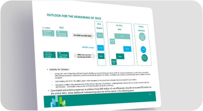 OUTLOOK FOR THE REMAINING OF 2015 2016 9m 2015 FY2015 2013 TARGET REAL OUTLOOK (in € million) Third party 387 9% to 10% revenue +46 (clearing) 5% CAGR over 2013-2016 ~€500m €393m 2-year (adjusted) = €433 million CAGR Q4’2014: €124m EBITDA margin ~ 53% 54.7% ~55% Cost base 302 -€80m net, run-rate (adjusted) +27 (clearing) ~€250m €191m €80m net Incl. D&A =€329 million by the end of 2016 efficiencies run-rate Q3’2015 €60m Activity for October: Listing: five new listings (AroundTownProperty Holding on Euronext Paris and Intertrust NV on Euronext Amsterdam), of which three EnterNext SMEs (Showroomprivé, Technofirstand KKO International) raised €719 million. €2.8 billion was raised in corporate bonds and €2.8 billion of follow- on equity. Cash trading: ADV of €7,735 million, down –4.8% compared to €8,124 million in October 2014 (Q4 2014 of €7,256 million) Derivatives trading: Index products ADV of 201,379 lots (Q4 2014: 276,280 lots) – Individual Equity Products ADV of 233,314 lots (ADV Q4 2014: 267,953 lots) – Commodity Products ADV of 57,163 lots (ADV Q4 2014: 61,601 lots) Cumulated restructuring expenses to achieve these €80 million of net efficiencies should not exceed €70 million by the end of 2015. Some additional restructuring expenses will be spent in the following years. 17