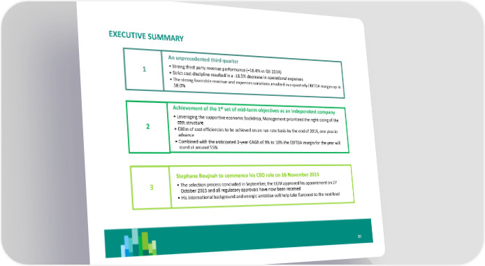 EXECUTIVE SUMMARY An unprecedented third quarter 1 • Strong third party revenue performance (+18.4% vs Q3 2014) • Strict cost discipline resulted in a -18.5% decrease in operational expenses • The strong favorable revenue and expenses variations resulted in a quarterly EBITDA margin up to 58.0% st Achievement of the 1 set of mid-term objectives as an independent company • Leveraging the supportive economic backdrop, Management prioritized the right-sizing of the 2 cost structure • €80m of cost efficiencies to be achieved on an run-rate basis by the end of 2015, one year in advance • Combined with the anticipated 2-year CAGR of 9% to 10% the EBITDA margin for the year will stand at around 55% Stephane Boujnahto commence his CEO role on 16 November 2015 3 • The selection process concluded in September, the EGM approved his appointment on 27 October 2015 and all regulatory approvals have now been received • His international background and energicambition will help take Euronext to the next level 20