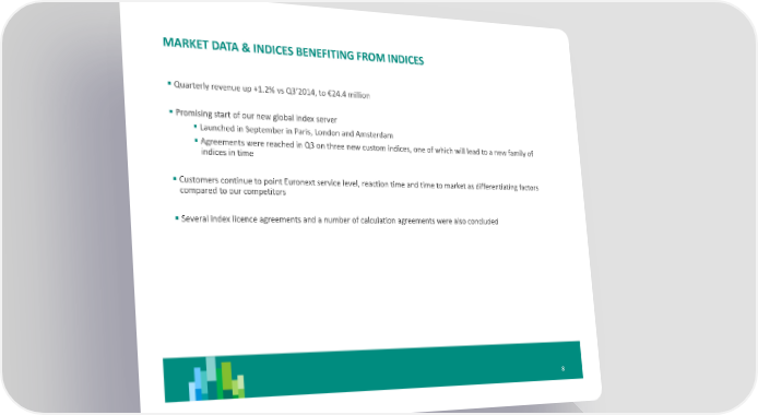 MARKET DATA & INDICES BENEFITING FROM INDICES Quarterly revenue up +1.2% vs Q3’2014, to €24.4 million Promising start of our new global index server Launched in September in Paris, London and Amsterdam Agreements were reached in Q3 on three new custom indices, one of which will lead to a new family of indices in time Customers continue to point Euronext service level, reaction time and time to market as differentiating factors compared to our competitors Several index licence agreements and a number of calculation agreements were also concluded 8
